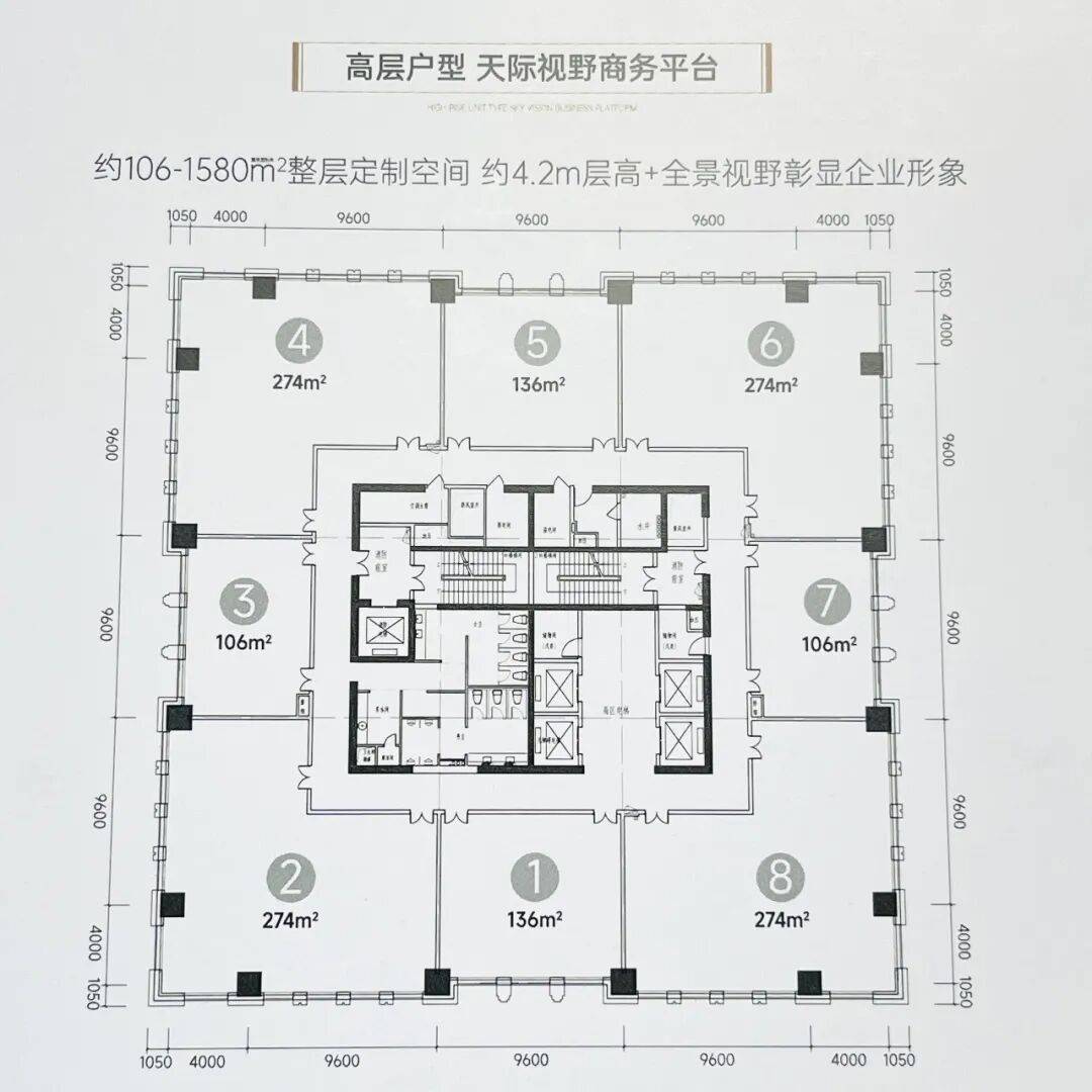 高楼层主打约106-1580㎡整层定制空间,约4.2米层高+全景事迹彰显企业现象。